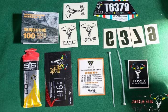 赛事包的物资来个合影。包括牛头的贴纸,扎带,VAUDE、KAILAS优惠券,SiS能量胶,号码牌,以及紧急联系卡。