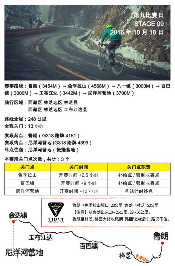 第九比赛日,从鲁朗到尼洋河营地,选手们必须要在13小时完成长达248公里的赛段,248公里,也是2016骑闯天路最长赛段!