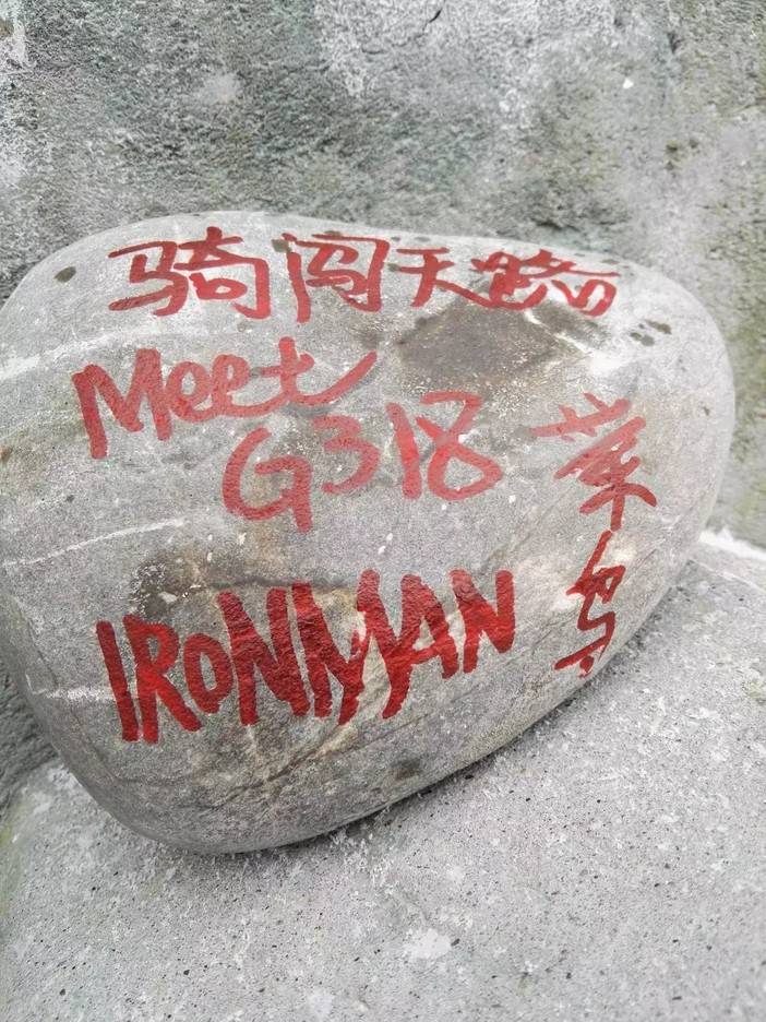 “逗逼哥”伍勇先,这回彻彻底底地浪漫了一把,在登上色季拉山口时,不顾早已疲惫的身体,甚至几乎忘记在关门点打卡,他掏出了带在身上的红笔,从地下捡了一颗鹅卵石,在上面写着:骑闯天路 Meet G318&IRONMAN 菜鸟。