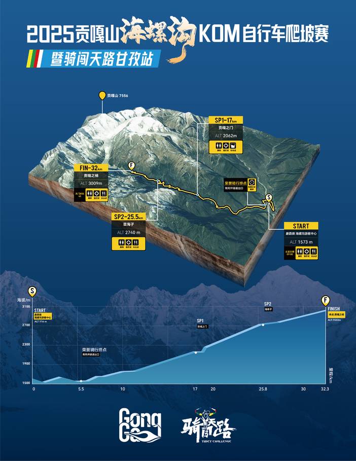 (1)赛事路线:海螺沟游客中心(起点,海拔1573米)-环城荣誉骑行-贡嘎大道--照光路-燕子沟路-观音古寺-青岗坪隧道-嘎木沟-共和村-杜鹃岭隧道-斑竹林隧道-贡嘎之门-第一观景台(贡嘎初见)-草海子--贡嘎之堂(三号营地金山饭店,海拔2850米——缆车站停车场,约32公里。