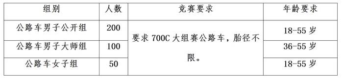 ④参赛车辆、头盔、装备、护具等自备,所用器材必须符合中国自协有关规定和组委会要求,否则不得参加比赛。赛前组委会将对参赛车辆进行资格检查,检查通过后方可参加比赛。即使是在赛后,一旦发现被裁判团队核准的违规使用比赛器材的行为,该选手也将被取消比赛成绩。参赛队员和车辆须按规定佩戴组委会统一配发的号码布与车牌,不得裁剪,一经发现,取消成绩。根据组别要求车辆要求:公路车为符合该项目规则标准的弯把公路大组赛赛车。